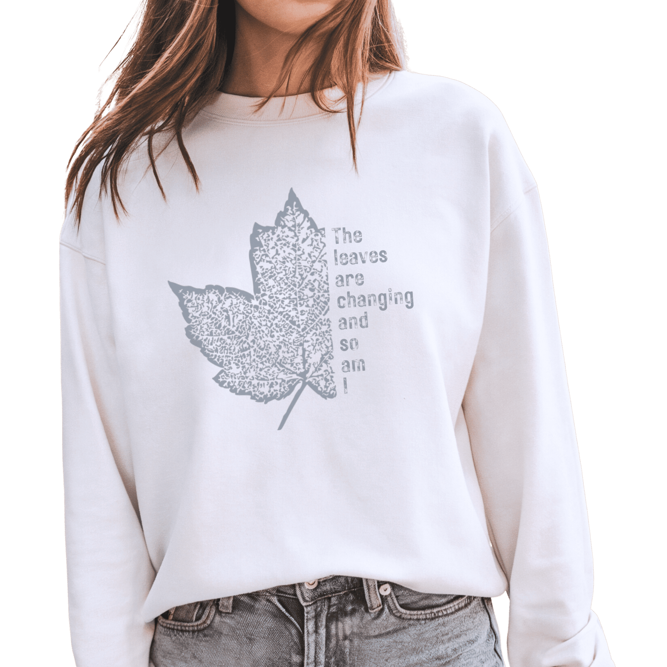 The Leaves of Change crewneck blends timeless design with nature’s poetry. A minimal leaf outline and the phrase “The leaves are changing and so am…